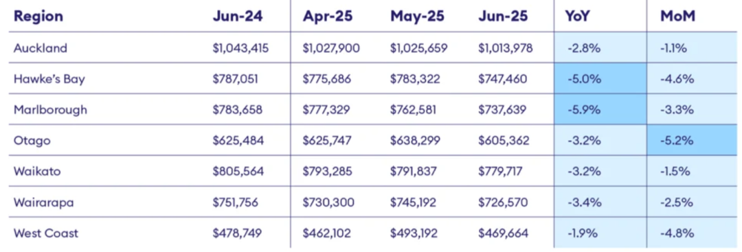 除此之外,共有7个大区出现挂牌价环比和同比双双下跌的情况,其中包括奥克兰大区、怀卡托大区和奥塔哥大区,其目前的挂牌价分别为1027900纽币、805564纽币和625484纽币,同比分别下降了2.8%、3.2%和3.2%,环比分别下降了1.1%、1.5%和5.2%。