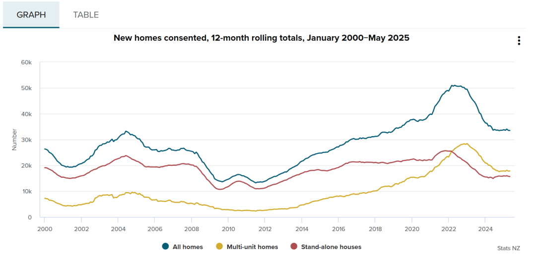 根据新西兰统计局最新发布的数据,截至今年5月的一年内,新西兰共有33,530套新住宅获得建筑许可,相比截至2024年5月的一年下降了3.8%。