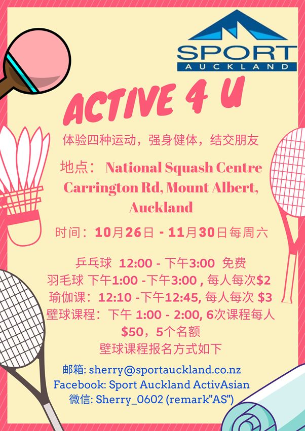 联系方式: Email:sherry@sportauckland.co.nz 加入我们的Facebook Group: https://www.facebook.com/groups/1717732324983844/