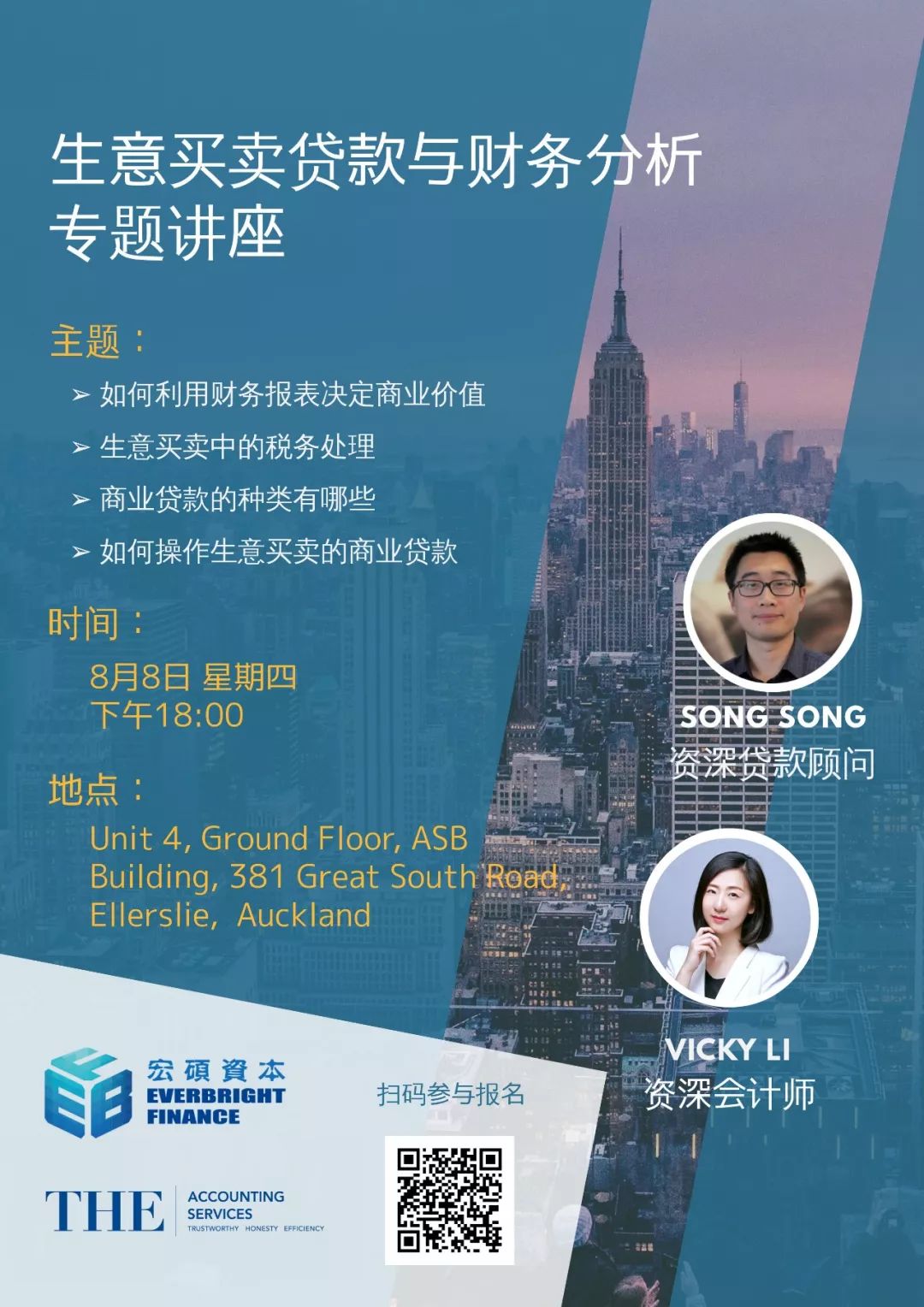 新西兰宏硕资本将携手The Accunting Services于8月8日举办生意买卖贷款于财务分析专题讲座,在主流银行中小企业商业贷款部门任职多年的Song Song与来自THE Accunting Services资深会计师Vicky Li为来宾分享