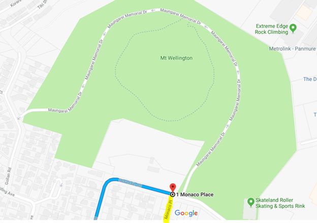 停车和集合地点:1 Monaco Place Mt Wellington, Auckland附近(下图标黄的小路)或者这条街附近的路上,停车位置有限,建议徒友们在Mt Eden War Memorial Hall拼车,当然如果住得近也可直接到达停车地点Monaco Place。