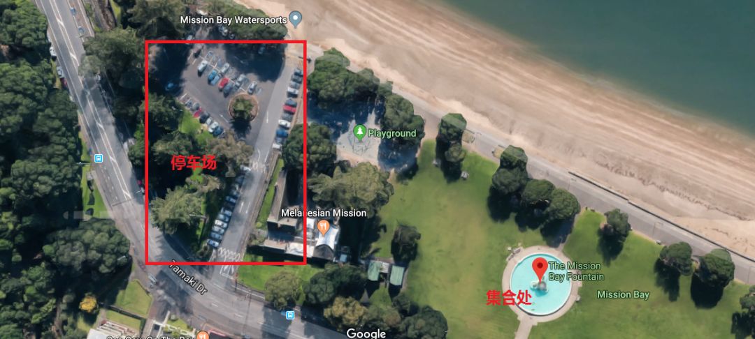 集合地点:Mission Bay喷泉,如下图红色大头钉处, the Mission Bay Fountain, Tamaki Dr, Mission Bay, Auckland 1071