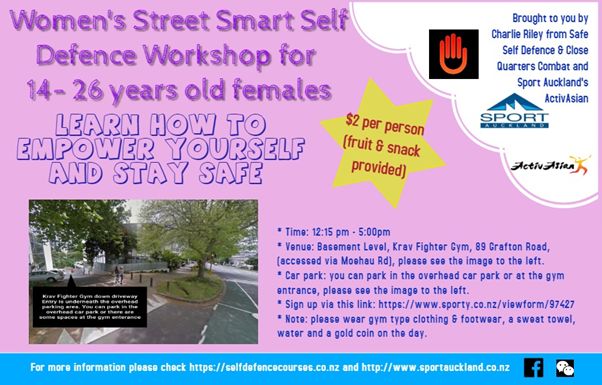 This high quality workshop is brought to you by Charlie Riley from Safe Self Defence & Close Quarters Combat and Sport Auckland’s ActivAsian. Charlie has run workshops for schools, universities and the community for over 10 years and has lots of experience teaching girls and young women to protect themselves in difficult situations. Ladies, don’t become a victim. Join us NOW!