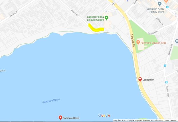 停车地点:Cleary Road, Panmure, Auckland(下图标黄的小路)靠近Lagoon Pool & Leisure Centre(图中绿色大头钉)。